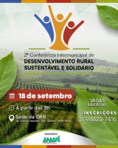 A Associação dos Municípios da Microrregião do Vale do Rio Piranga (AMAPI) realiza no dia 18/09 em Ponte Nova à 2° Conferência Intermunicipal de Desenvolvimento Sustentável e Solidário com as presenças de vários municípios filiados o evento acontece na sede da OAB/Ponte Nova.
