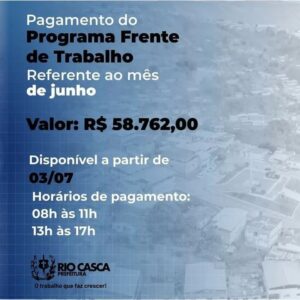 O pagamento dos trabalhadores da frente de trabalho já está disponível no setor de tesouraria da Prefeitura.