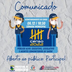 A Prefeitura de Guaraciaba comunica e convida a todos para reunião de acompanhante do Censo 2022 que está acontecendo em nosso município, a realizar-se na próxima terça-feira (06) às 18:30, no Plenário da Câmara Municipal.