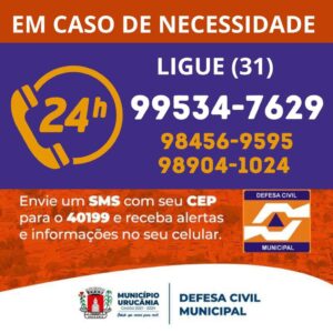 Em caso de necessidade e emergência a população poderá entrar em contato com a Defesa Civil municipal através dos números citados 24 horas por dia.