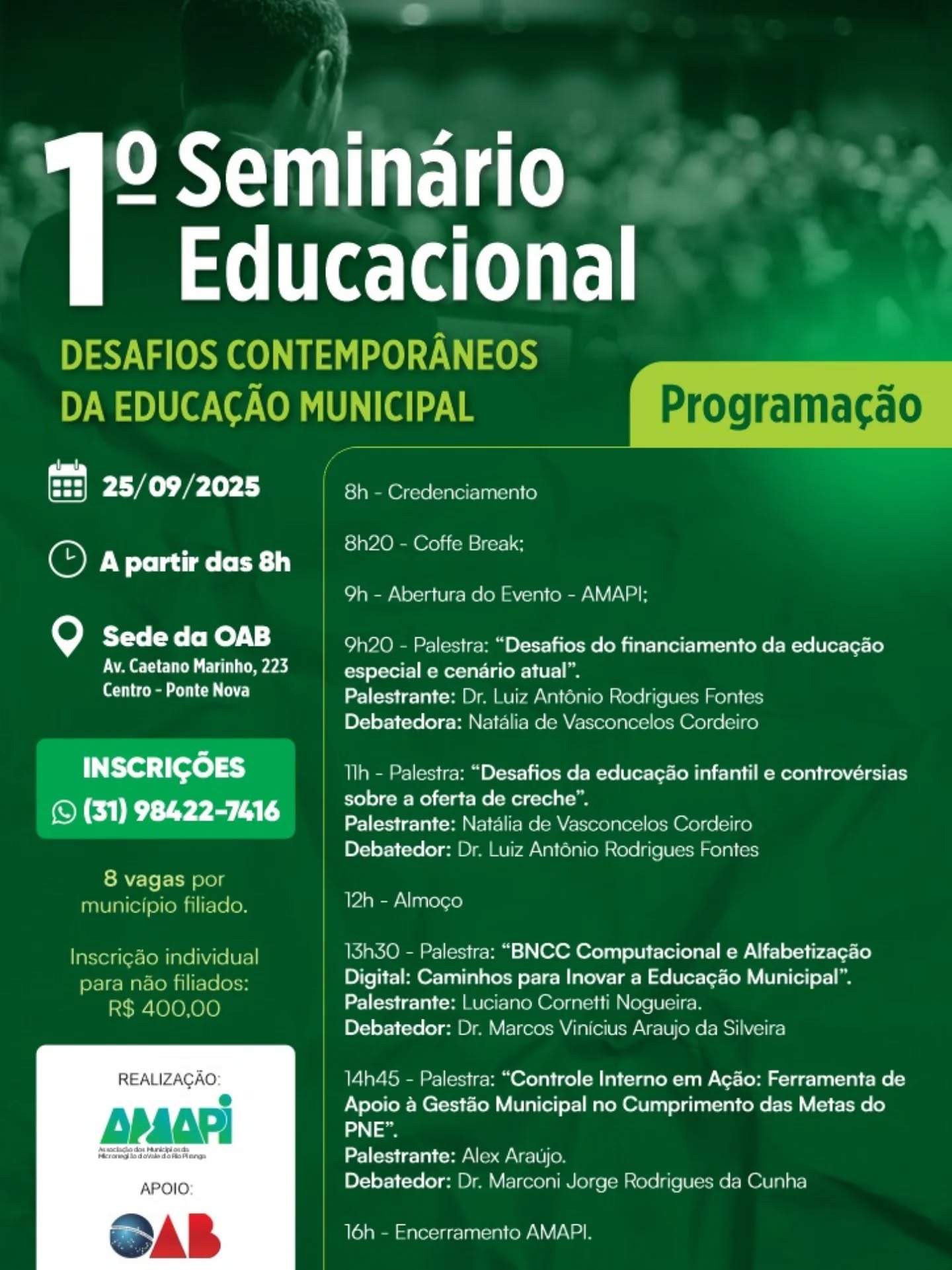 Vem aí o 1° Seminário Educacional com o tema ” Desafios Contemporâneos da Educação Municipal”, promovido pela Associação dos Municípios da Microrregião do Vale do Rio Piranga e apoio da OAB/ Ponte Nova. Dia: 25/09/2025 Horário: À Partir das 08:00 da Manhã. Local: Sede da OAB/Ponte Nova Avenida Caetano Marinho 223 Centro