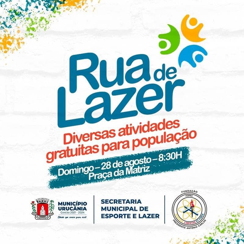 Neste domingo, 28 de agosto, a partir das 8:30h, acontece a 1ª edição da Rua de Lazer na Praça da Matriz. Traga seu filho, convide seus amigos e venha participar das diversas atividades gratuitas que serão oferecidas aos urucanienses. Urucânia mais lazer!