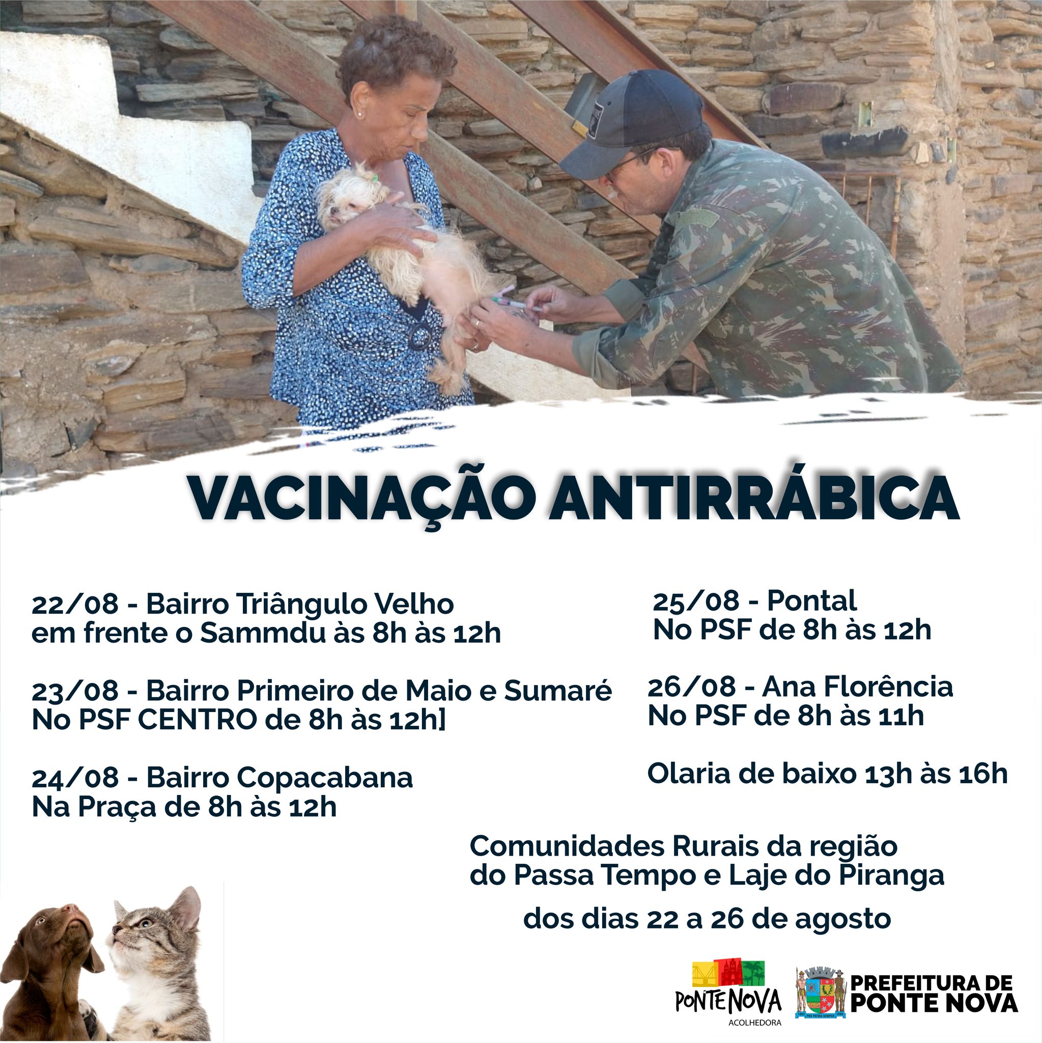 Veja a programação da campanha de vacinação contra a raiva animal (cães e gatos), realizada pela Secretaria Municipal de Saúde (Semsa). Estamos na quarta semana de ação. Fique atento aos dias e horários do seu bairro. pontenova.mg.gov.br youtube.com/PrefeituradePonteNova #prefeituradepontenova #trabalhandoporvocê #saúde #vacinacaocaninaca #caes #gatos