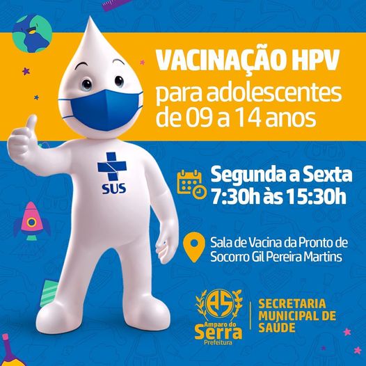 Olá, Amparo do Serra! . A Secretaria Municipal de Saúde segue trabalhando e convocando a população para as campanhas de vacinação. Atenção, adolescentes de 9 a 14 anos: vacinação contra o HPV, de segunda a sexta, das 7:30h às 15:30h, na sala de vacina do Pronto Socorro Gil Pereira Martins. . Venha vacinar. Vacina salva vidas!
