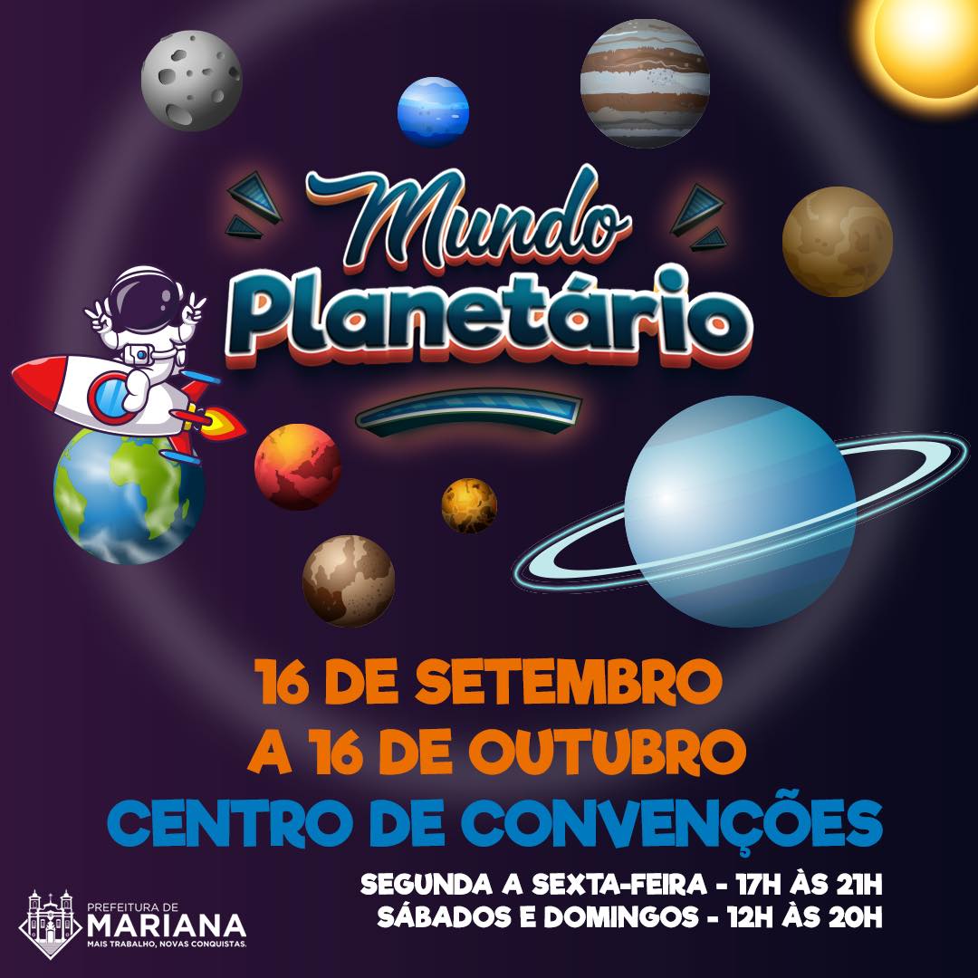 O “Mundo Planetário” já está em Mariana! Junte a família, os amigos e embarque conosco por uma viagem pelo universo. A exposição ficará aberta gratuitamente para visitação, no Centro de Convenções, até o dia 16 de outubro. Não perca! #PrefeituraDeMariana #MarianaMG #SecretariaDeGoverno #ComunicacaoMariana #SecretariaDeCultura #MundoPlanetario