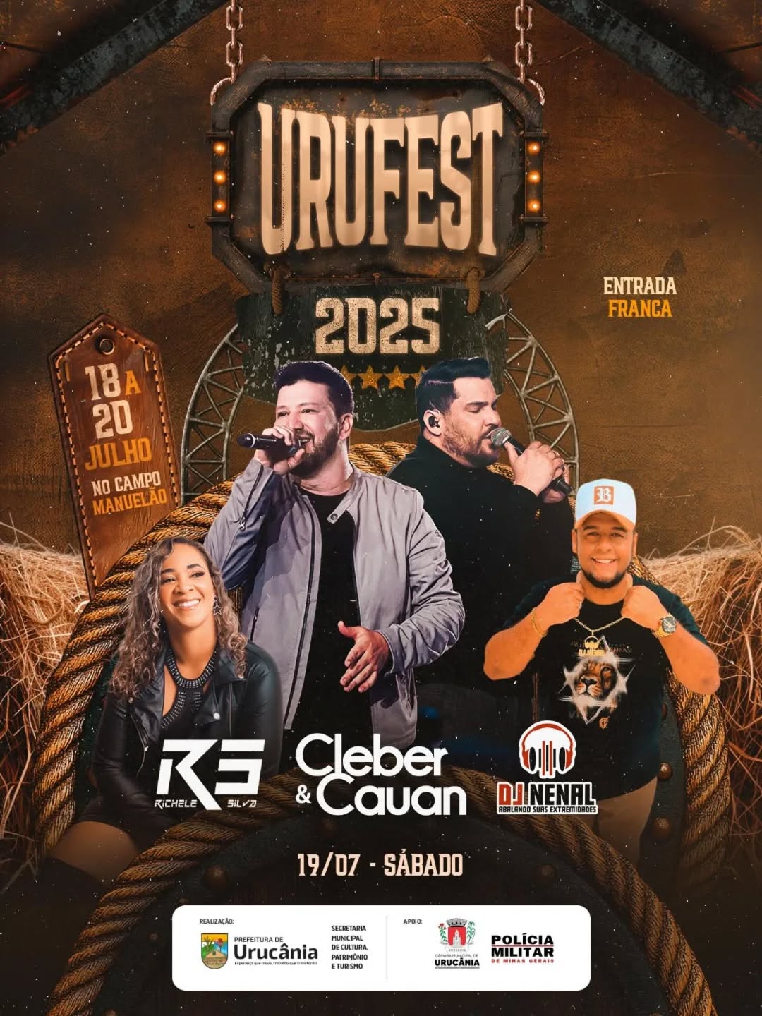 O sábado da URUFEST 2025 promete! No dia 19 de julho, o Campo do Manoelão será novamente o ponto de encontro da alegria com uma programação de peso: Richele Silva, a nossa prata da casa, abrindo a noite com muito talento e orgulho urucaniense! Em seguida, a dupla Cleber & Cauan sobem ao palco com seus sucessos que fazem o Brasil cantar! E pra fechar