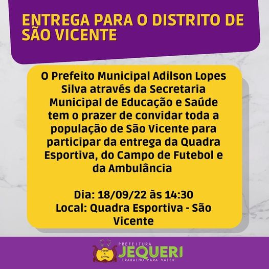 CONVITE PARA TODA POPULAÇÃO É com grande alegria que convidamos a população para a entrega da Quadra Esportiva. Anote na agenda e venha participar: domingo, fia 18/09 às 14:30. Compartilhe com todos os familiares e não fique de fora. Prefeitura de Jequeri.