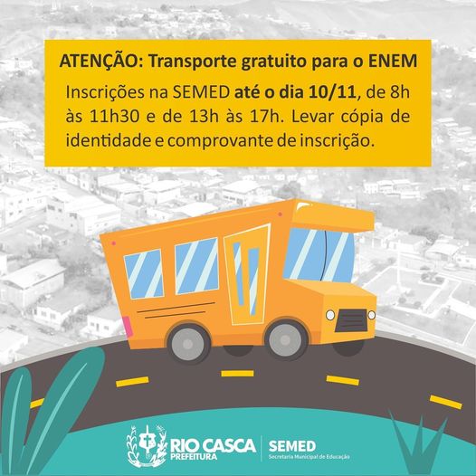 ATENÇÃO! . A Prefeitura de Rio Casca, através da Secretaria Municipal de Educação, disponibilizará transporte gratuito para realização da prova do ENEM, em Ponte Nova. As inscrições deverão ser realizadas até o dia 10/11, de 8h às 11:30h e de 13h às 17h, na sede da SEMED. . É obrigatório a apresentação da cópia da identidade e comprovante de inscrição. . #riocasca #educação #otrabalhoquefazcrescer