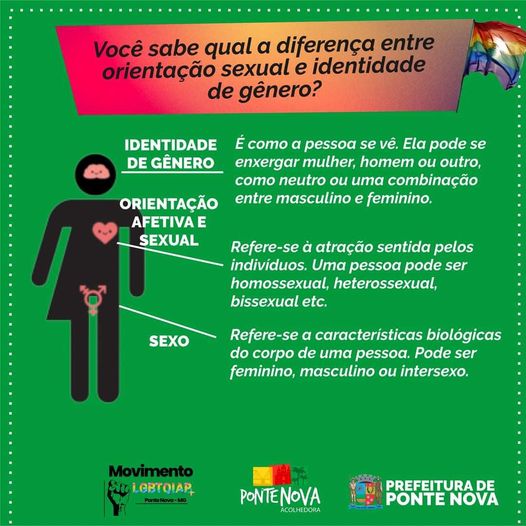 Orientação sexual relaciona-se com o desejo afetivo ou sexual de uma pessoa por outra. Principais formas: Identidade de gênero diz respeito a como a pessoa se sente e se percebe em relação ao seu gênero, de maneira profunda e estritamente particular. Uma pessoa pode ter a identidade de gênero como feminina, masculina, trans, travesti — ou também ser designada como mulher, homem, mulher trans, travesti,