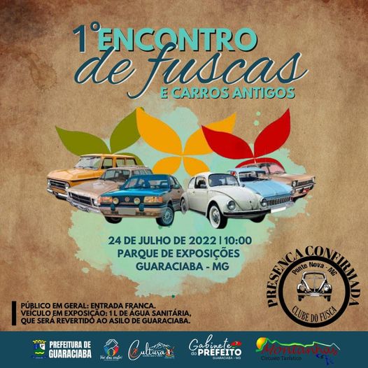 I ENCONTRO DE FUSCAS E CARROS ANTIGOS DE GUARACIABA A Prefeitura Municipal de Guaraciaba, através da Secretaria de Cultura, Esportes, Lazer e Turismo, com o apoio do Clube do Fusca de Ponte Nova, realizará no próximo dia 24 de julho de 2022, o I ENCONTRO DE FUSCAS E CARROS ANTIGOS DE GUARACIABA, às 10:00 no Parque de Exposições em Guaraciaba. Estamos preparando atrações exclusivas para
