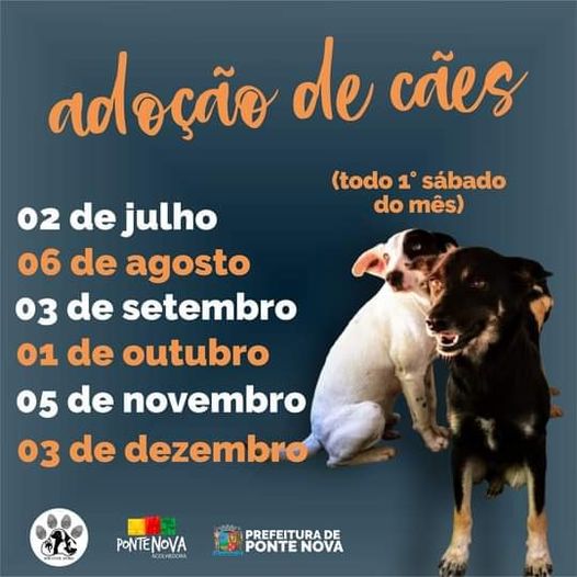 Confira o cronograma da Campanha de Adoção de Cães de Ponte Nova. O evento ocorrerá todo 1° sábado do mês. – 02 julho; 06 agosto; 03 setembro; 01 outubro; 05 novembro; e 03 dezembro. O local e horário serão divulgados na véspera de cada evento. Para este sábado já temos o local definido: Praça de Palmeiras. Das 9h às 13h.