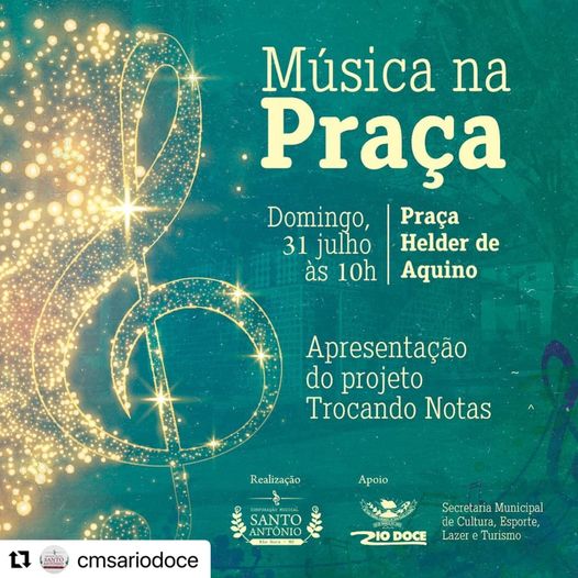 Olá, Rio Doce! A Corporação Musical Santo Antônio retorna as atividades do projeto Trocando Notas comandado pelo Professor Weslei Cunha, com apresentação no próximo domingo (31), a partir das 10:00 horas na Praça Helder de Aquino. Contamos com a sua participação!