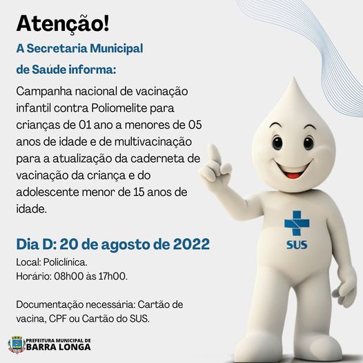 Todas as Unidades de Saúde estão com vacinas disponíveis da campanha de Multivacinação. Crianças de 6 meses até 5 anos vão receber a dose extra contra Poliomielite, e adolescentes com até 15 anos podem tomar o reforço contra a Meningite e HPV. Além das doses contra Covid-19 e Influenza, as demais vacinas estarão disponíveis para que todos atualizem o Cartão de Vacinação.