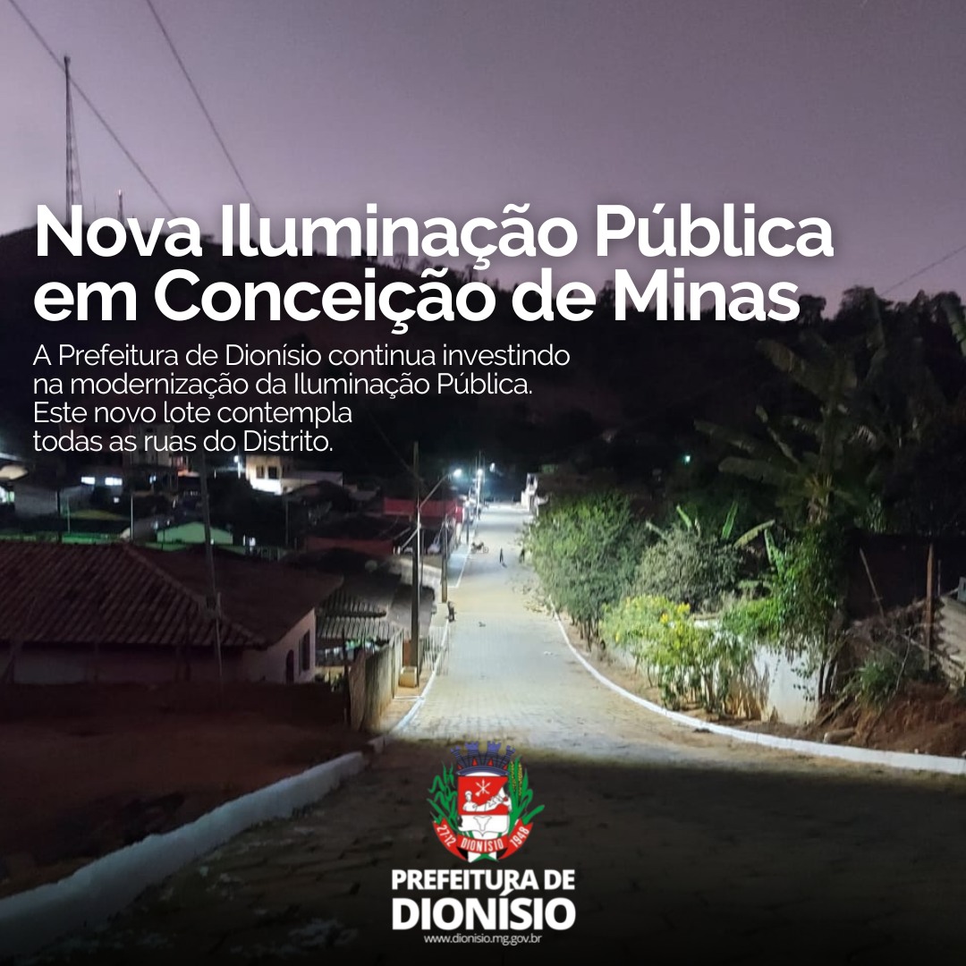 A Prefeitura de Dionísio continua investindo na modernização da Iluminação Pública. Neste novo lote, todas as ruas do Distrito de Conceição de Minas serão equipadas com as luminárias em LED, substituindo as antigas lâmpadas a vapor. Com muita seriedade, transparência e amor pela nossa Dionísio, nossa Administração continua trabalhando para os dionisianos. 3