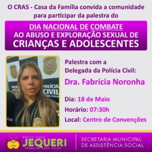 O CRAS- Casa da Família convida a comunidade para participar da palestra do Dia Nacional de Combate ao Abuso e Exploração Sexual de Crianças e Adolescentes