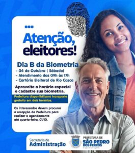 No sábado, 04 de outubro, será realizado o Dia B da Biometria no Cartório Eleitoral de Rio Casca, com atendimento especial das 09h às 17h.
