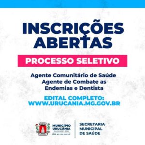 A Prefeitura de Urucânia, através da Secretaria Municipal de Saúde, informa que estão abertas as inscrições para o Processo Seletivo Simplificado, visando à contratação de pessoal por prazo determinado, e/ou cadastro de reserva, para os seguintes cargos: Agente Comunitário de Saúde, Agente de Combate as Endemias e Dentista.