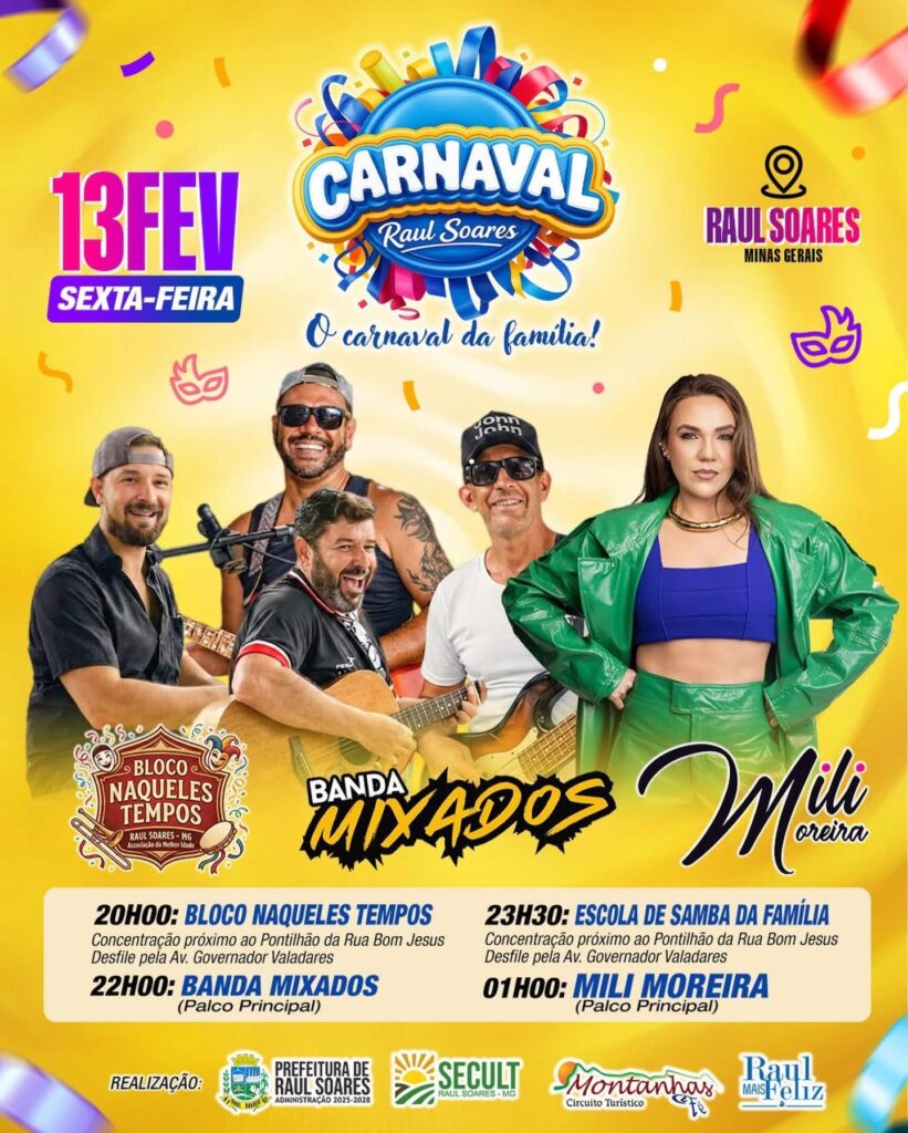 O Carnaval de Raul Soares começa do jeito que a cidade gosta: tradição na rua, energia lá em cima e programação pra todo mundo. 🔥