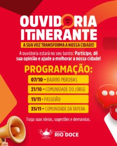 O Município de Rio Doce segue fortalecendo o diálogo com a nossa gente! Através da Ouvidoria Itinerante, estaremos presentes em diferentes comunidades.